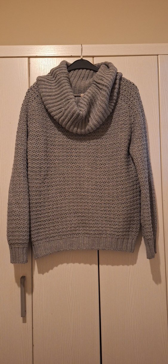 Gri renkli, örgü dokulu, boğazlı ve uzun kollu, kadın kazak. Rahat dokusu ve normal boyu ile günlük kullanım için uygundur.
