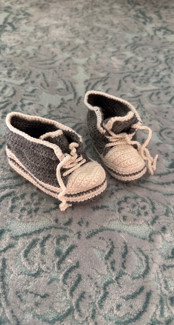 Gri örgü iplikten yapılmış, bağcıklı, sade ve desensiz erkek bebek patikleri. Küçük ayaklar için rahat ve sıcak. El emeği konvers şeklinde ev ayakkabıları. Makineden yıkanabilir.