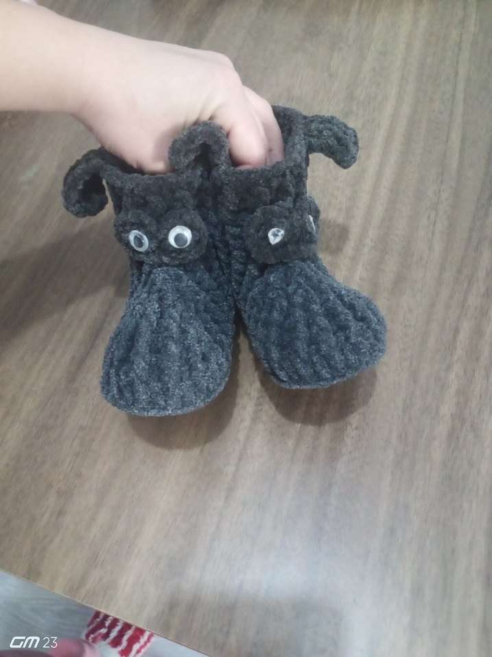 Gri örgü erkek bebek patik, yumuşak dokulu örgü kumaştan, sade ve desensiz, gotik tarzda.