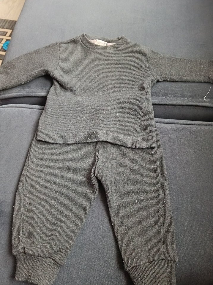 Gri renkli, örgü dokulu erkek bebek takımı, uzun kollu ve yuvarlak yakalıdır. Pantolonlar rahat kesim ve lastikli paçalara sahiptir. 3- 6ay