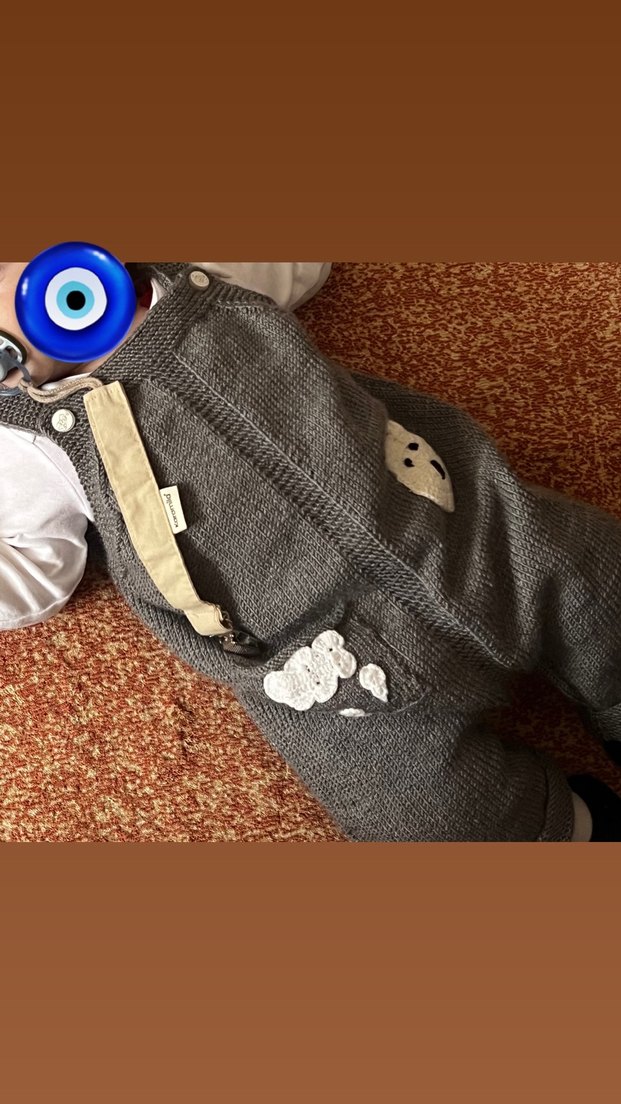 Yumuşak örgü kumaştan, nakışlı detaylara sahip gri renkli, kolsuz ve bol kesim erkek bebek tulumu. Detay için sorunuz. 3 aylıktan 1 yaşa kadar örülür. Fiyatlar 3-6 ay için 350, 6-9 ay için 500 ( resimdeki bu) 9-12 ay yani 1yaş için olanlar 650.