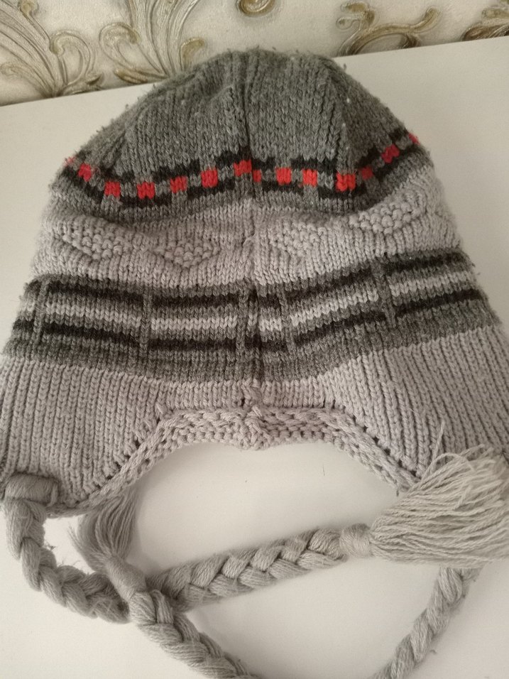 Gri örgü erkek çocuk bere, örgülü bağcıklar ve desenli detaylarla bohem ve retro tarz sunar. Sıcak ve rahat bir görünüm sağlar.