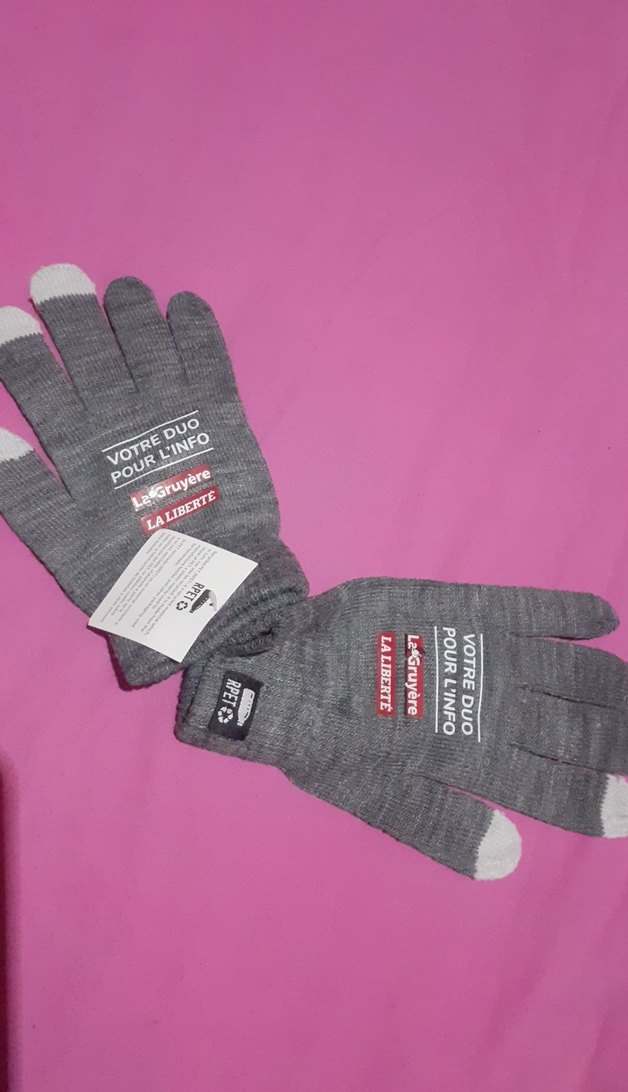 Yumuşak kumaştan gri örgü erkek çocuk eldivenler, üzerinde 'VOTREDU' yazısı ve baskılı detaylar bulunur.
