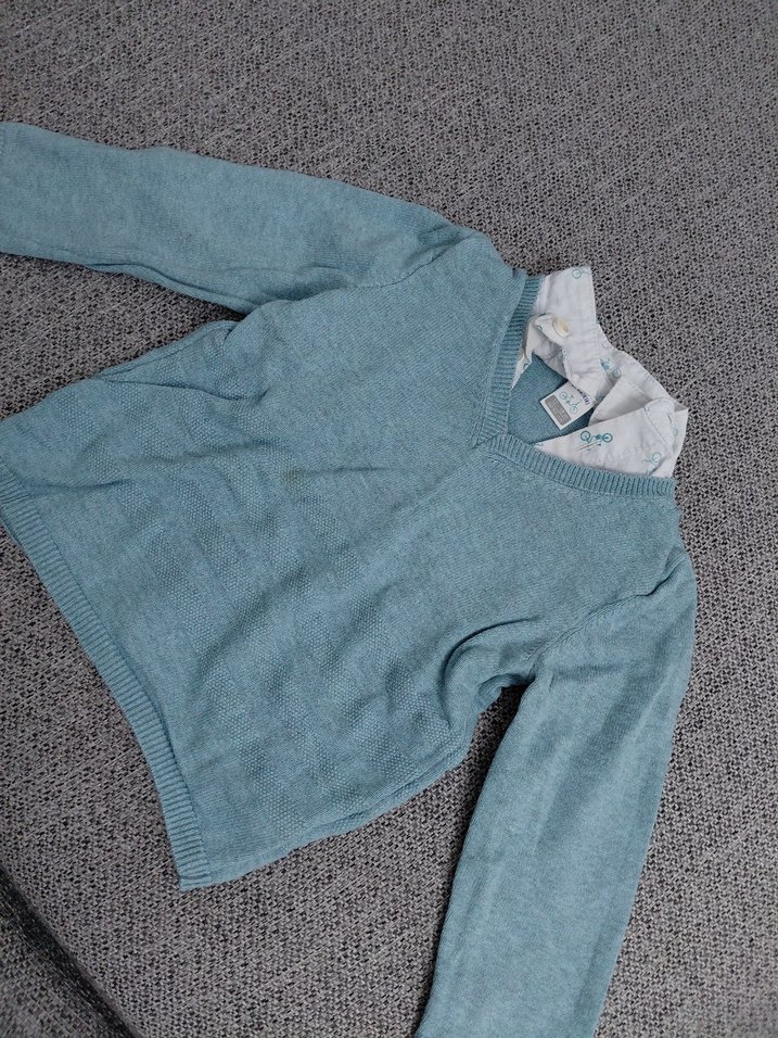 Gri renkli, uzun kollu, örgü yün erkek çocuk kazak, yakalı ve rahat kesimlidir. Trendy casual tarz için uygundur. kırmızı hırka hediyedir
