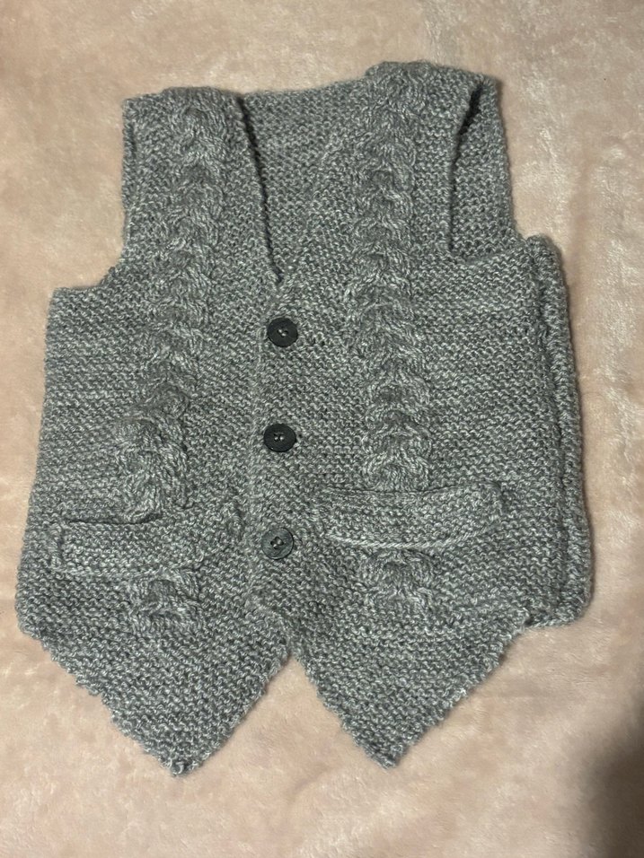 Gri renkli, örgü dokulu, kolsuz erkek çocuk yeleği. Notlu yaka ve düğmeli kapama ile sade, bohem tarzda, normal kesim. En 26 cm Boy 30 cm