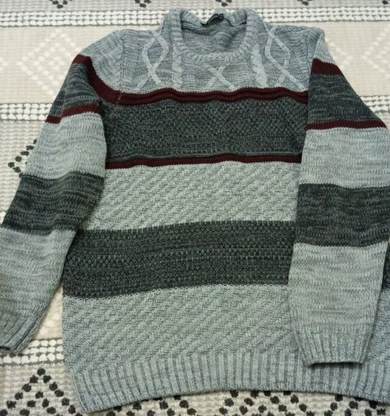 Bu erkek kazak, gevşek kesim, yuvarlak yaka ve uzun kolludur. Farklı gri tonlarda örgü desenlerle günlük kullanıma uygun rahat ve çağdaş bir stile sahiptir.