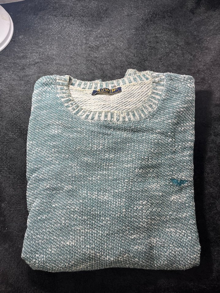 Gri örgü yün kazak, yuvarlak yaka ve uzun kolludur. Rahat kesimi ve günlük kullanıma uygun normal uzunluktadır.