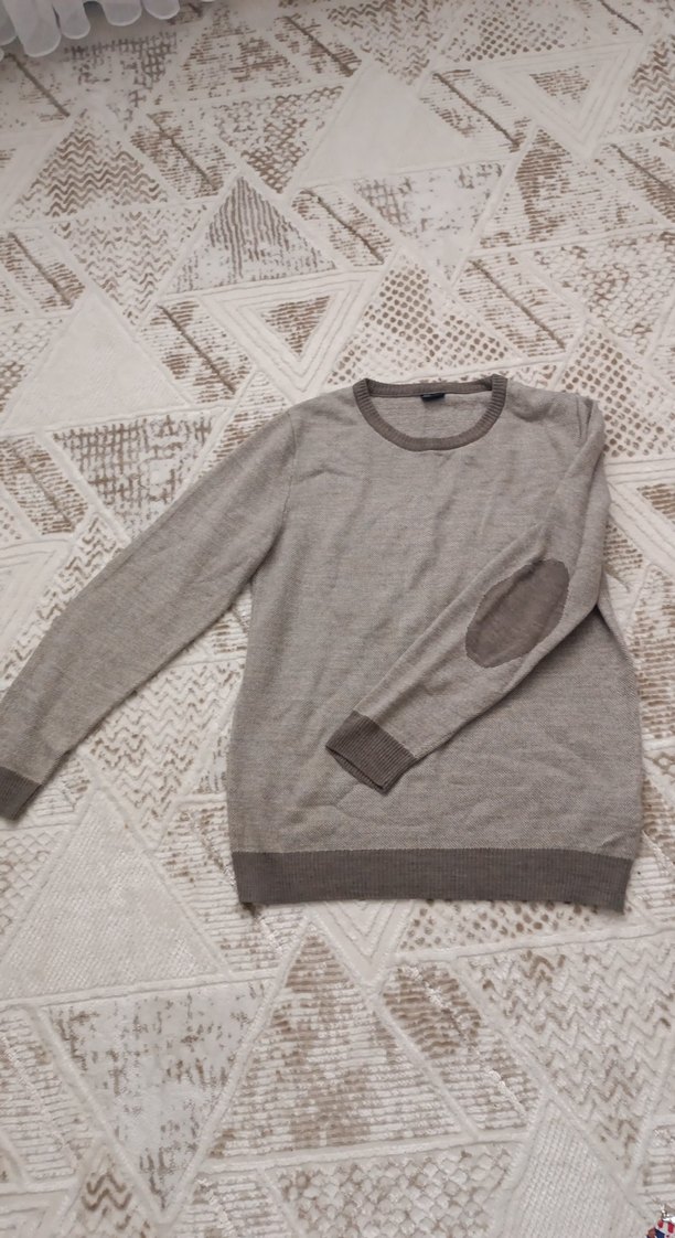 Gri renkli, örgü kadın triko kazak, yuvarlak yaka ve dirsek detaylı uzun kolludur. Yumuşak keten kumaştan, rahat ve normal boydadır.