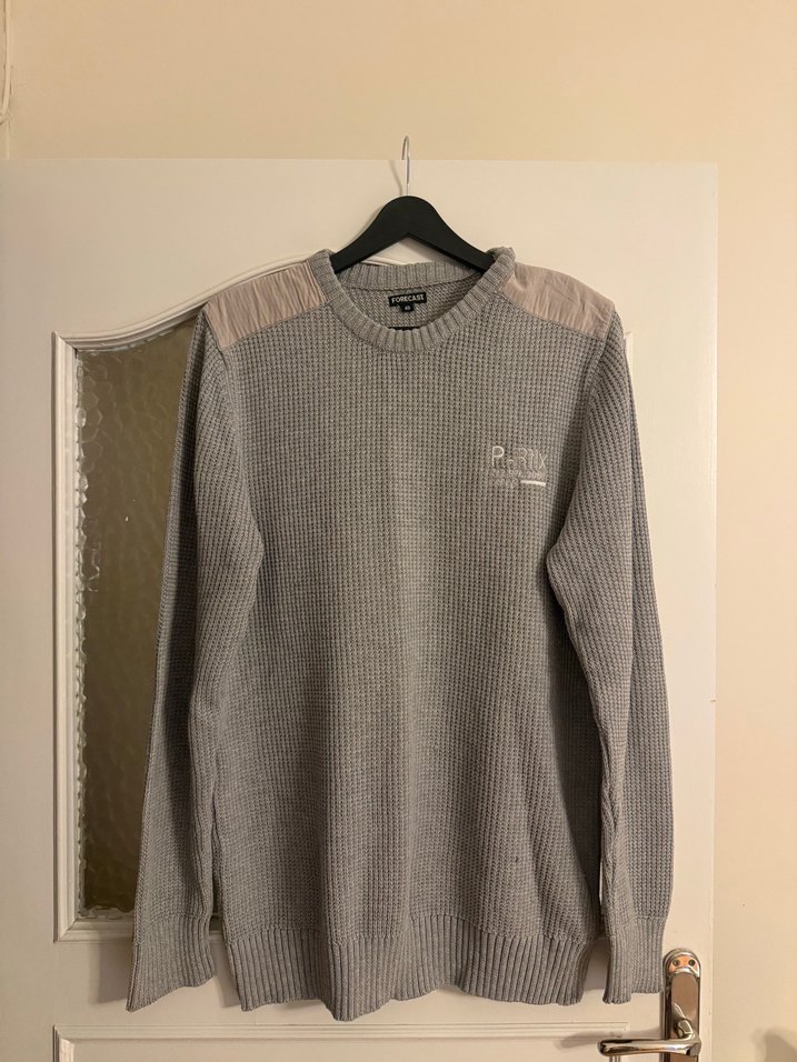 Gri renkli, yumuşak yün kumaştan örülmüş, yuvarlak yakalı ve uzun kollu erkek triko kazak, rahat ve bol kesimdir.
