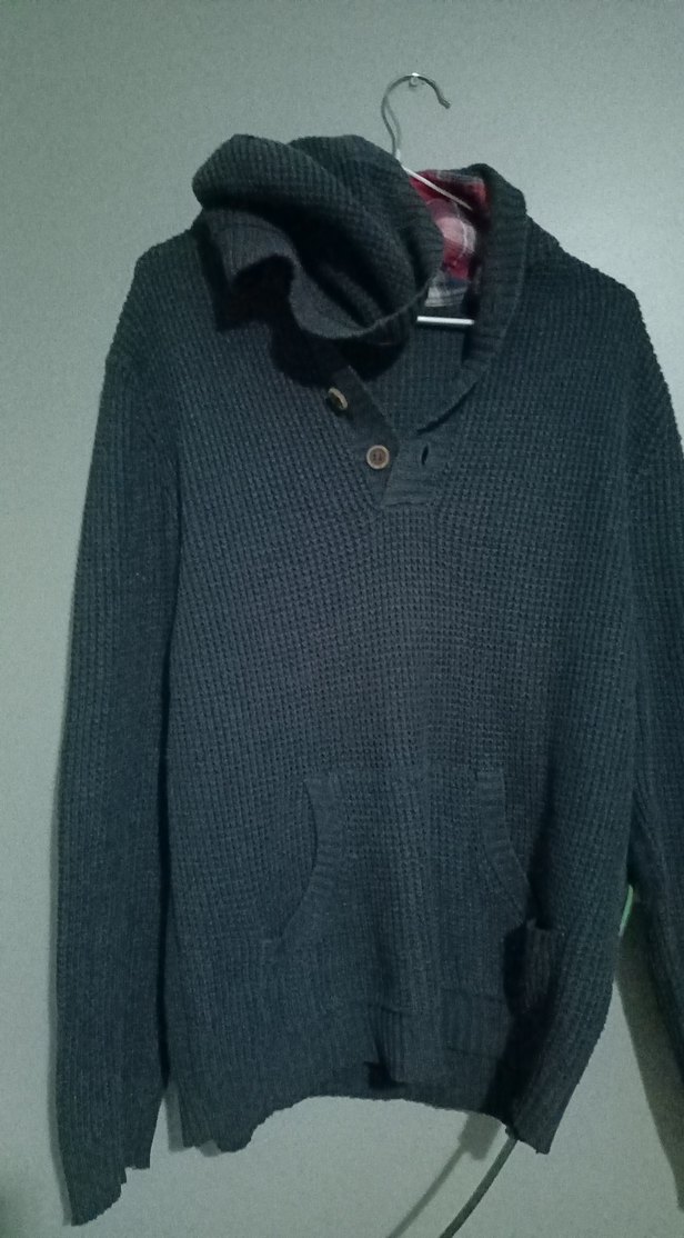 Gri örgü erkek triko kazak, yakalı ve uzun kolludur. Yumuşak yün kumaştan üretilmiş, bol kesim ve normal uzunluktadır.