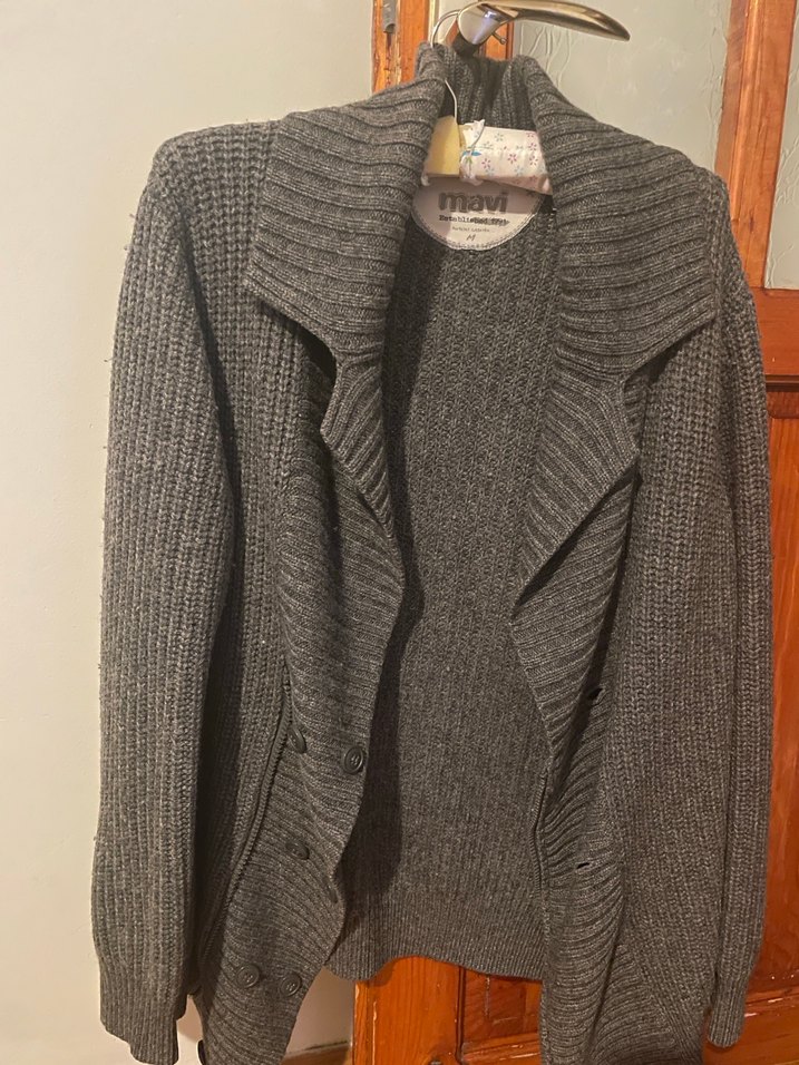 Gri renkte, yumuşak yünden örülmüş, uzun kollu ve normal boyda, rahat kesim erkek hırka. Notlu yaka detayıyla günlük kullanıma uygundur.