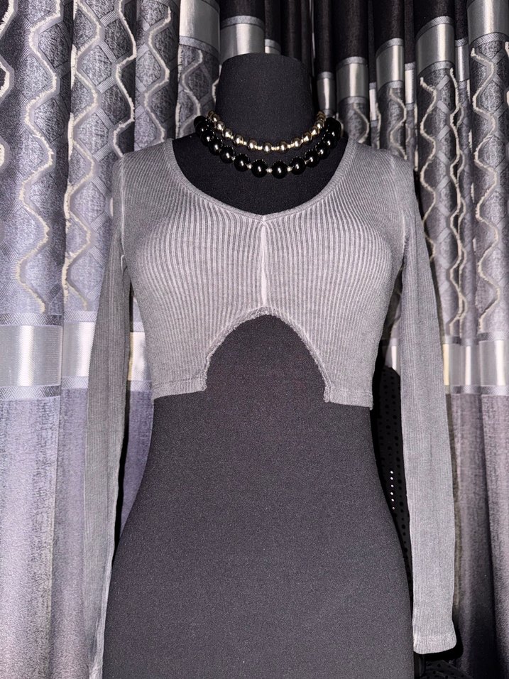 Gri örgü malzemeden yapılmış, uzun kollu ve yakalı, fit kesim gotik tarzda kısa kazak. Günlük kullanıma uygun.