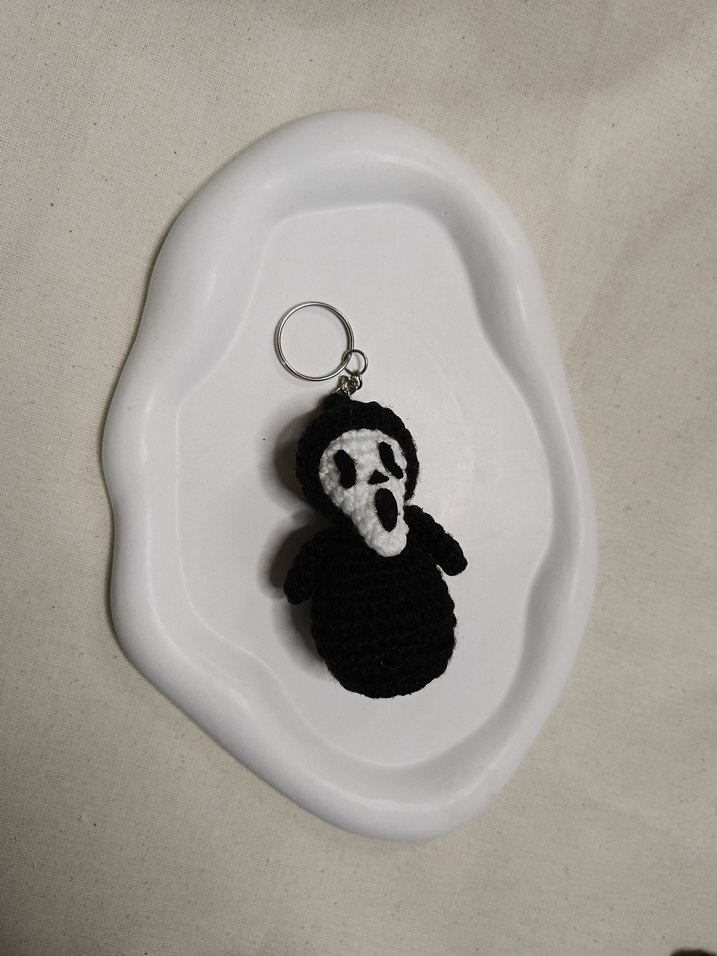 Koyu gri örgü malzemeden yapılmış, gotik hayalet yüz tasarımlı anahtarlık. Rock punk havası katan benzersiz bir aksesuar.