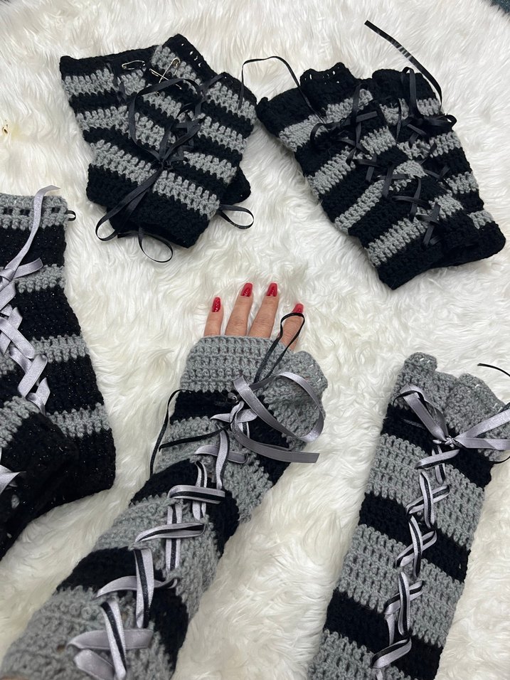 Gri renkli, örgü kumaştan yapılmış gotik kadın eldivenleri, bağcıklı detaylarıyla rahat ve avant-garde bir tarz sunar.