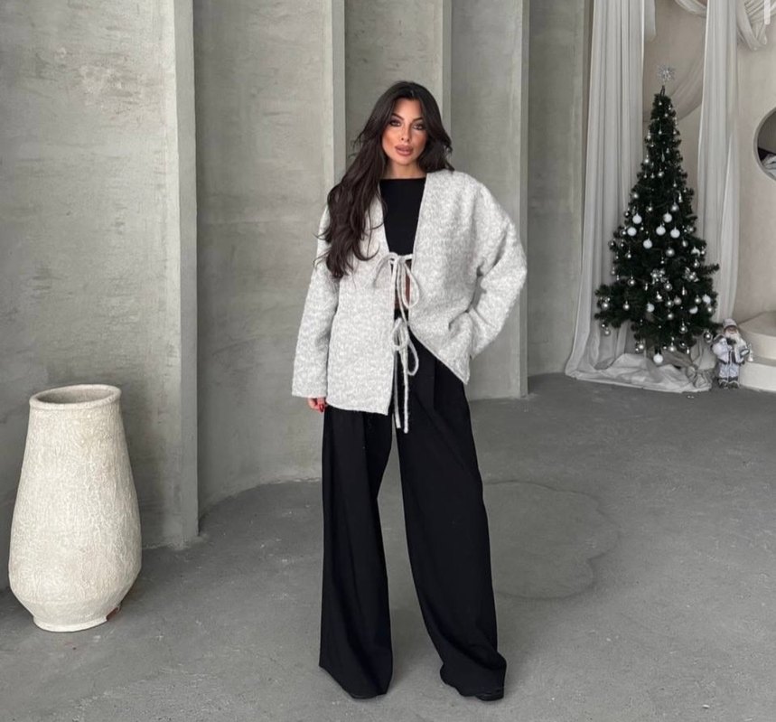 Gri renkte, yün örgü kumaştan, bol kesim ve Önde bağlamalı, günlük sokak stiline uygun s m l