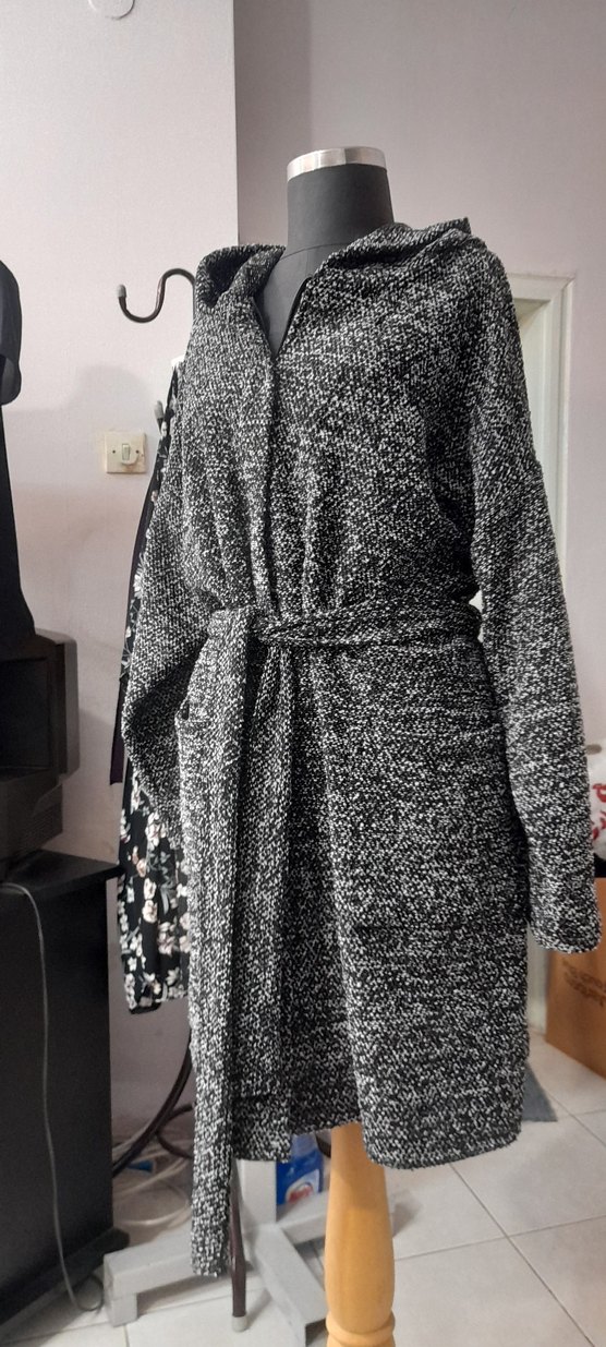 Bu gri örgü hırka kaban uzun kollu ve geniş kesimdir. Yaka detayı ve kemeriyle modern bir tarz sunar, günlük kullanım için uygundur. 38 40 50 bedene kadar.