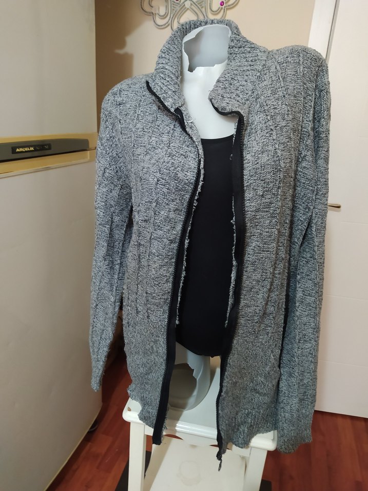 iki koltuk altından ölçüsü 62 cm boyu 76 cm Gri örgü hırka yüksek yakalı ve uzun kollu, midi boyda ve düzenli kesimdedir. Rahat örgü kumaşı günlük soka ar k tarzına uygundur.