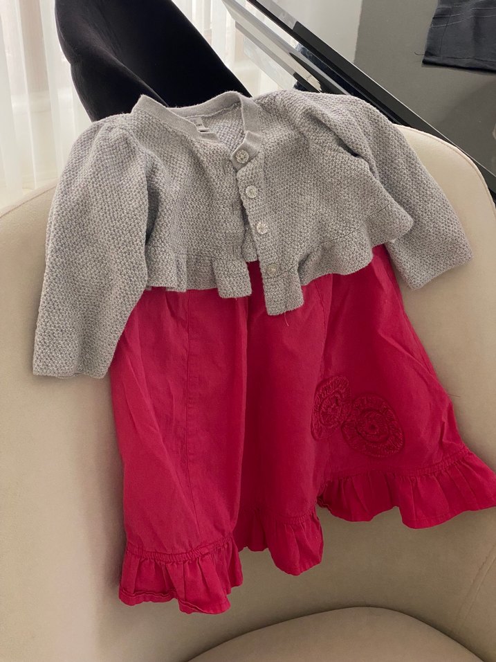 Gri örgü uzun kollu hırka ve fırfırlı, işlemeli canlı pembe etekli bol kesim kız elbisesi. Rahat ve şık bir kombin sunar.