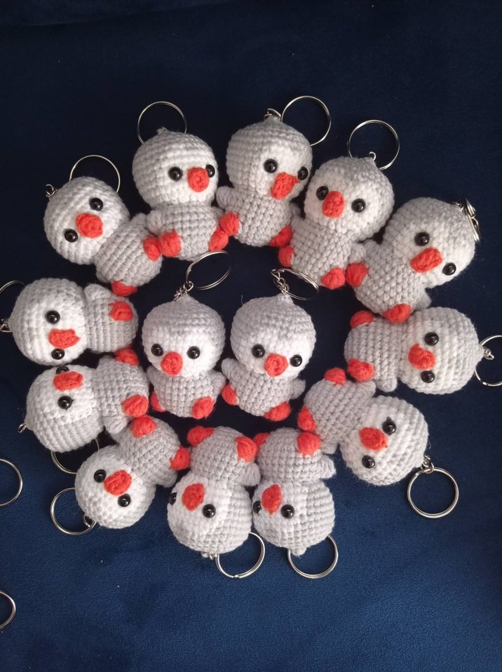 Renkli detaylara sahip gri örgü figürlerden oluşan rahat kadın anahtarlıklar, anahtarlarınıza sade bir dokunuş katıyor .