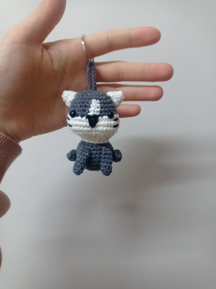 Gri örgü malzemeden yapılmış, küçük hayvan figürlü, sade ve rahat tarzda kadın anahtarlık.