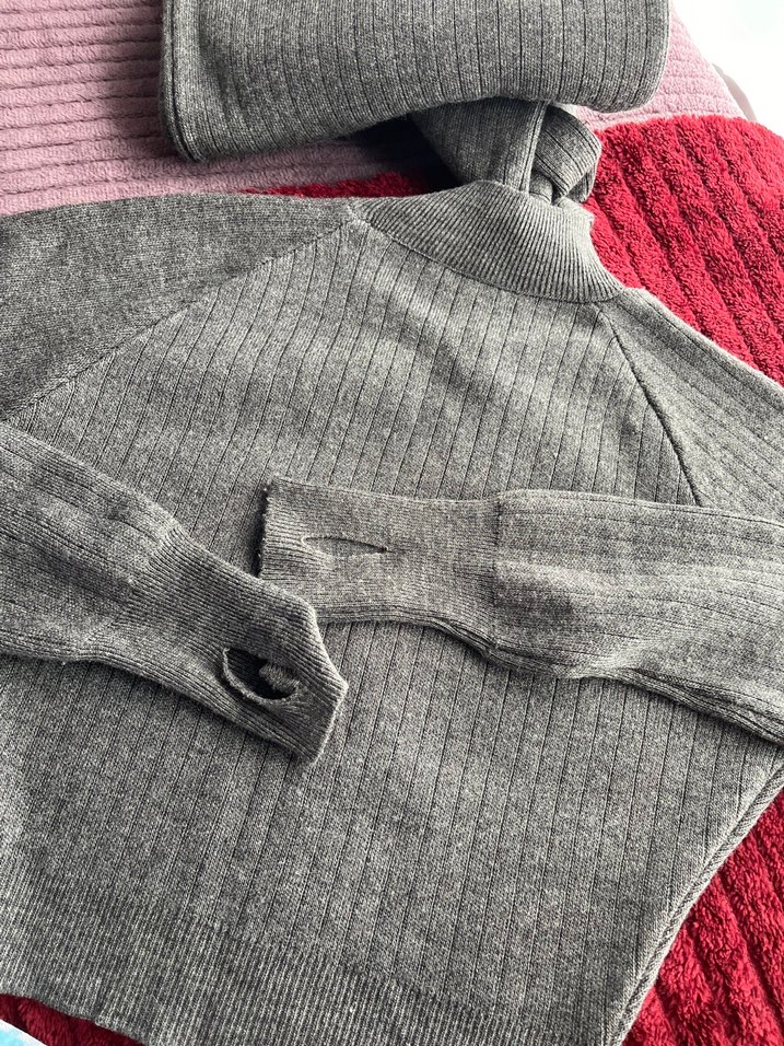 Gri renk, balıkçı yaka, uzun kollu ve vücuda oturan örgü kadın kazak. Günlük kullanım için yumuşak ve rahat bir dokusu vardır.