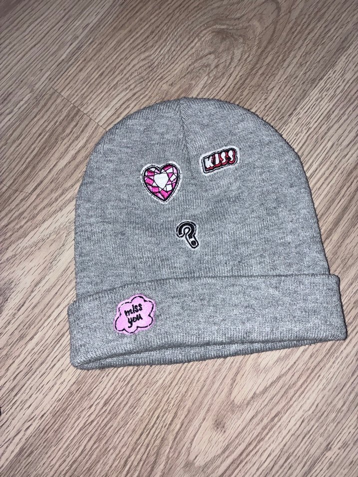 Gri örgü kadın bere, kalp ve çeşitli eğlenceli yamalarla süslenmiştir. Rahat ve trend sokak tarzına uygundur.