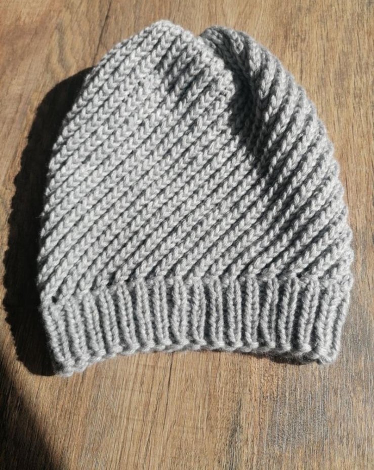 Gri renkte, yumuşak örme yapılmış kadın bere, sade ve rahat bir bohem tarz sunar.