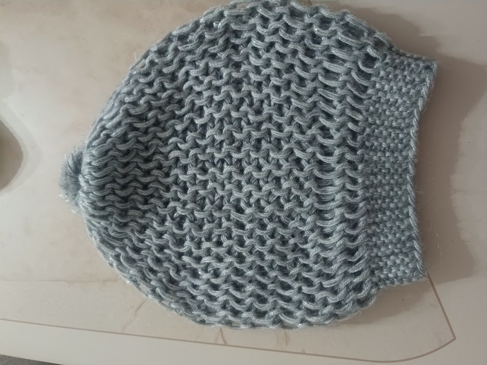 Gri örgü malzemeden örülmüş, sade ve temel tarzda kadın bere, normcore görünüme uygundur.