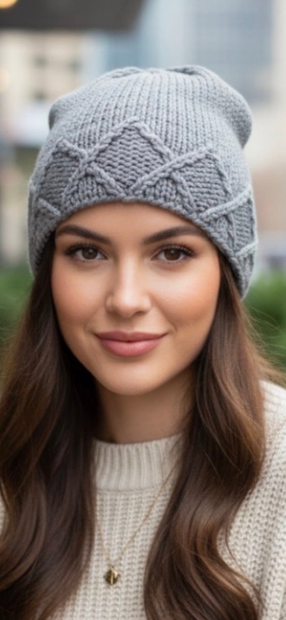 Yumuşak gri renkte, örgü kumaştan yapılmış, bohem tarzı desenli rahat kadın bere. Serin havalar için uygundur. Yapay zeka ile giydirilmiştir