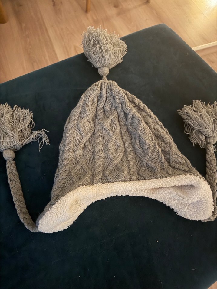 Gri örgü kadın bere, içi yumuşak astarlı ve püsküllü, bohem ve retro tarzları birleştirir, sıcak ve şık bir görünüm sunar. ❄️