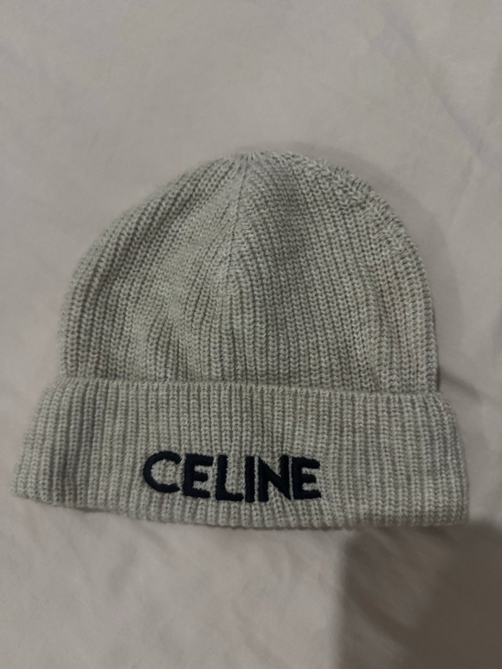 Gri örgü kumaştan yapılmış, rahat ve basic tarzda kadın bere. Katlanabilir kenarında "CELINE" nakışı bulunur.