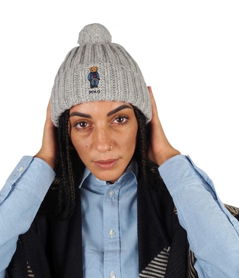 Yumuşak yünden örülmüş gri kadın bere, küçük işlemeli ayı detayı ve sokak stili tasarımıyla trend şıklık sunar.