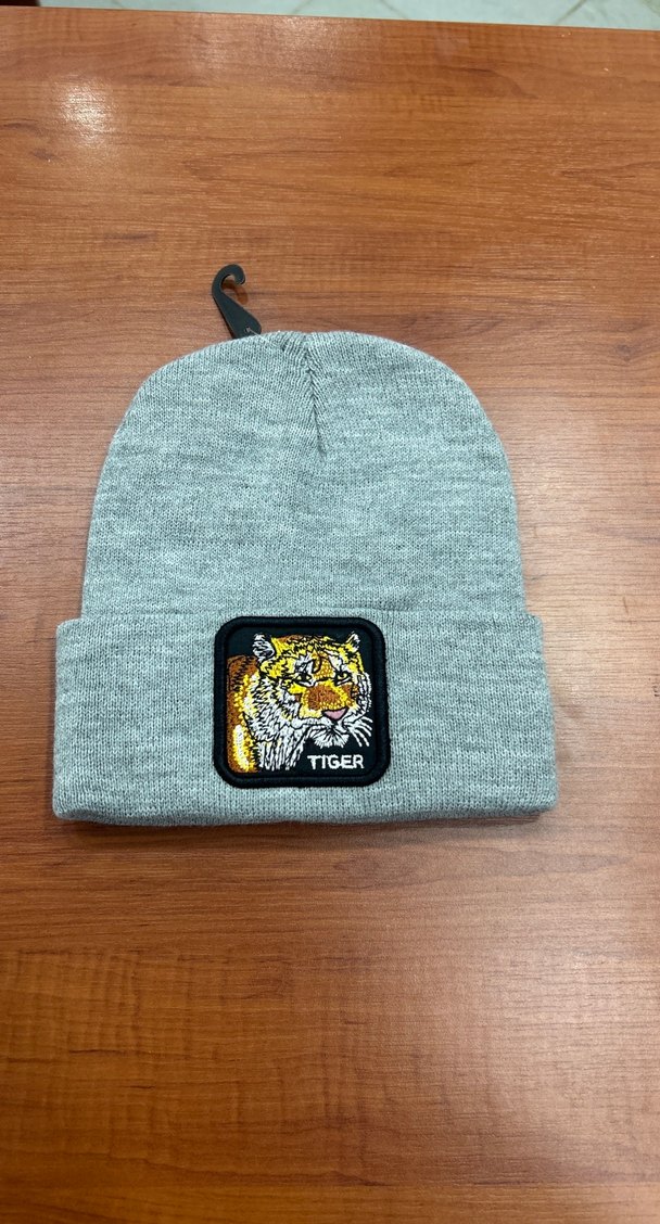 Yumuşak ve sıcak keçe kumaştan yapılmış, kaplan işlemeli gri örgü kadın bere, trend şık görünüm için uygundur.