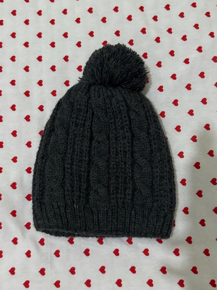 Gri renkte, örgü dokulu, ponponlu kadın bere, sade ve rahat tarzı tamamlar.