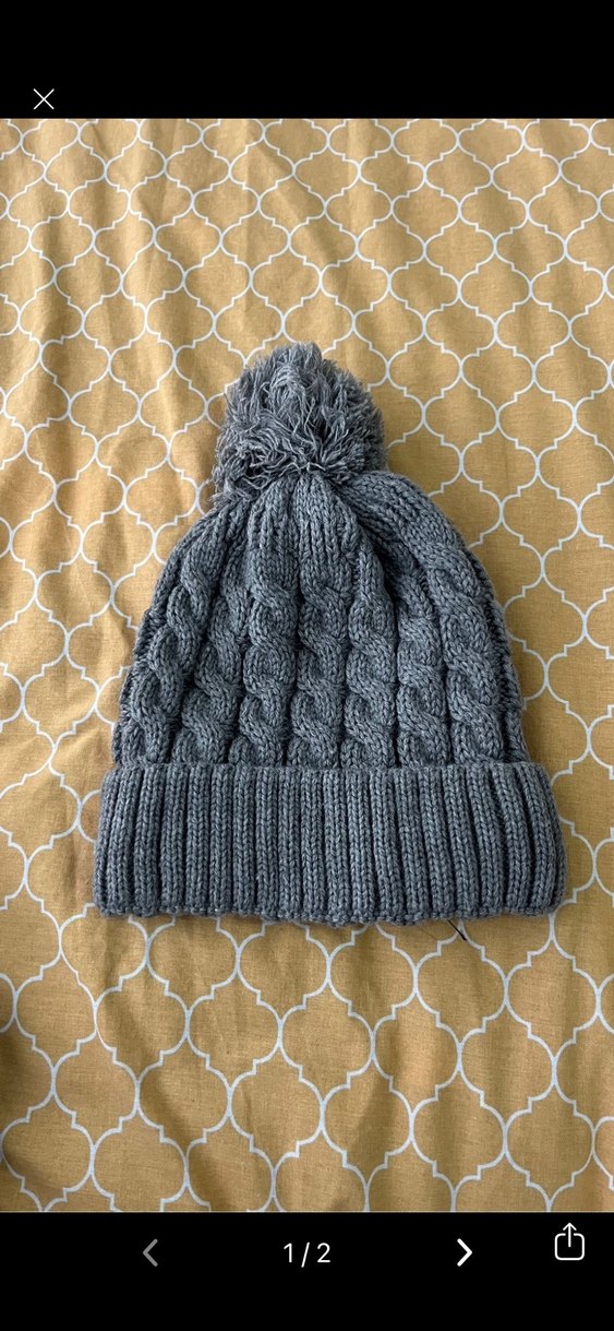 Gri renkte, örgü desene sahip kadın bere, üstünde ponpon ile bohem tarzda ve rahat bir yapıya sahiptir.