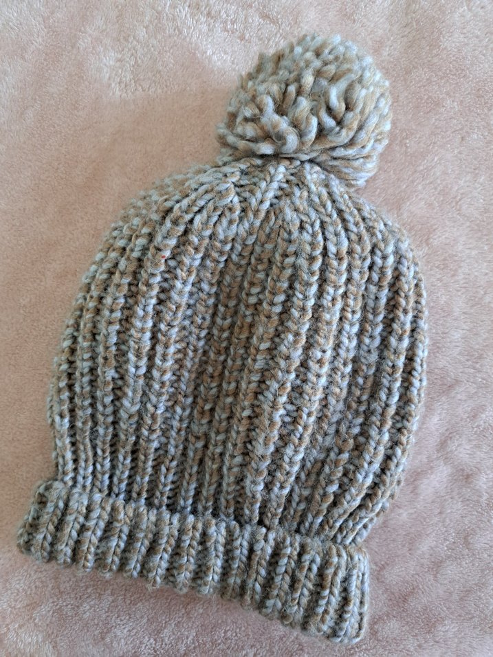 Bu kadın bere, üstünde ponpon bulunan yumuşak gri örgü dokusuna sahiptir. Rahat ve sade, bohem tarzda bir tasarımdır.
