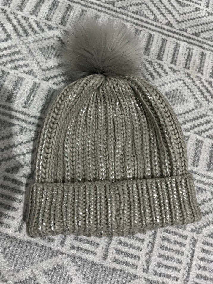 Gri renkli, örgü dokulu kadın bere, üstünde yumuşak ponpon ile rahat ve sade bohem tarzda.