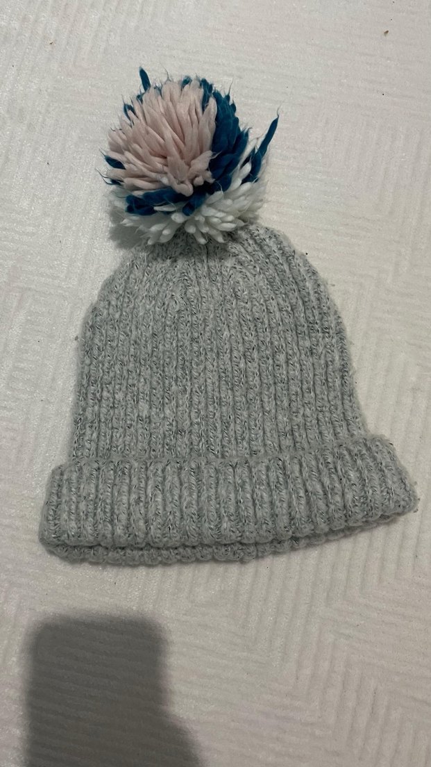 Kadınlar için gri renkte, yumuşak örgü kumaştan yapılmış, renkli ponponlu rahat bir bere.
