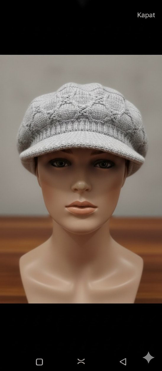 Gri renkte, örgü dokusuyla kadın bere şapka. Yapılı bir siperliği vardır, sıcak ve rahat bir kullanım sunar.