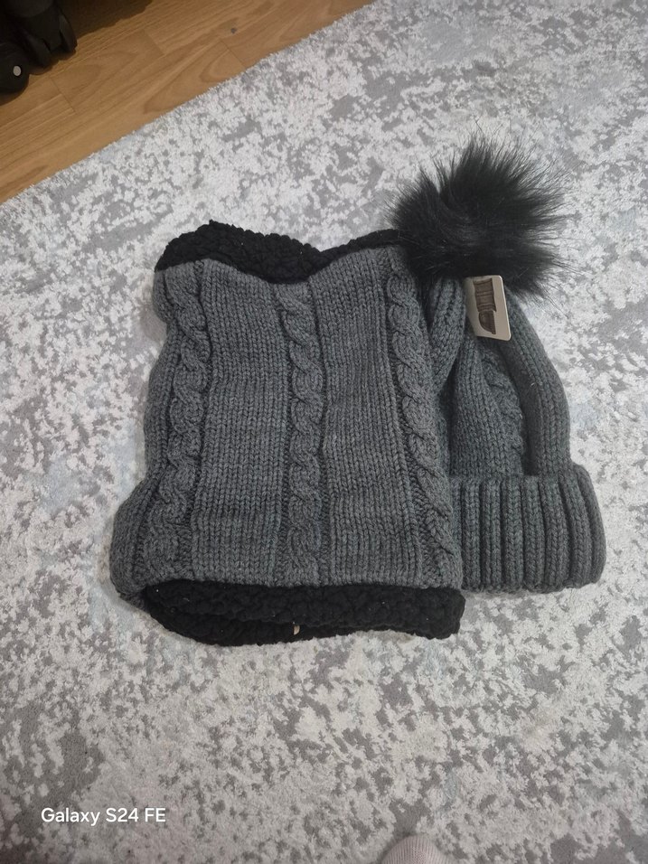 Sokak tarzına uygun, yumuşak dokulu gri örgü bere ve siyah peluş ponponlu boyunluk seti. ❄️
