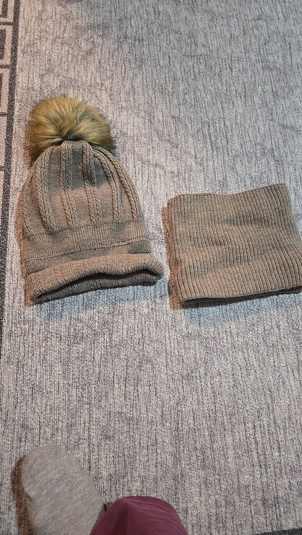 Gri örgü kadın bere ve boyunluk seti, yumuşak ve rahat kumaşlıdır. Bere üzerinde suni kürk ponpon bulunur.