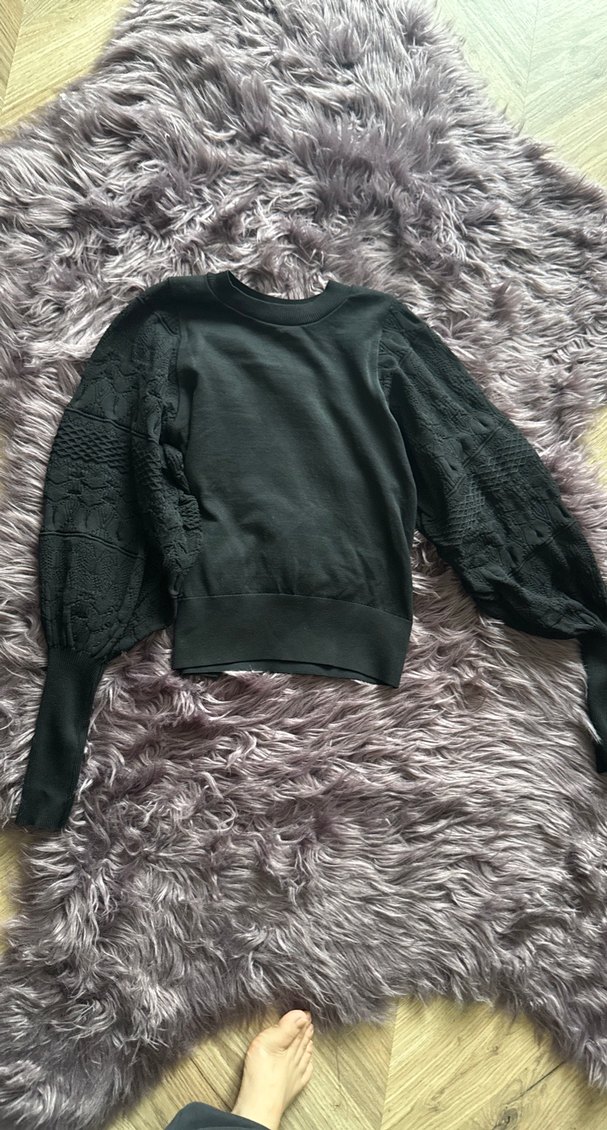 Gri örgü kadın bluz, uzun dokulu kollar ve salaş kesim ile. Yuvarlak yaka ve kısa boy özelliklerine sahiptir, günlük kullanım için uygundur.