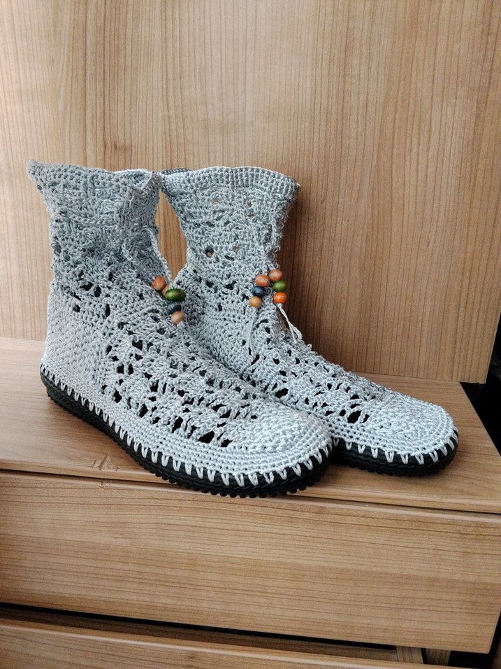Gri örgü kumaştan yapılmış, nakış desenli ve boncuk detaylı bohem tarzı 39numara yazlık bot. iç tabanı yoktur. isteğe bağlı tam yarı ortopedik iç taban koyabilirsiniz