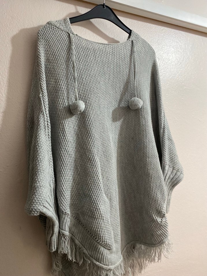Gri renkli, örgü kumaştan yapılmış kadın salaş kazak. Uzun kollu, yuvarlak yaka ve püsküllü detaylara sahip bohem stilde, günlük kullanıma uygundur.