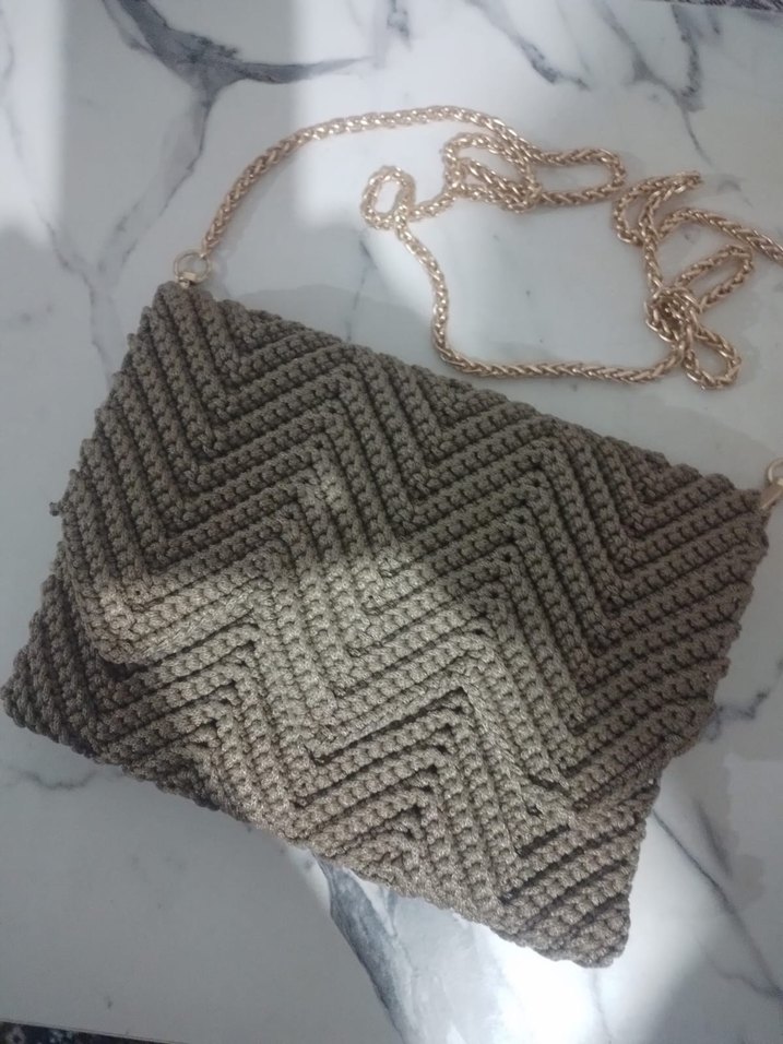 Gri örgü kadın çanta, rahat dokusu ve zikzak desenli yapısıyla bohem tarzını yansıtıyor, altın zincir askıya sahip.
