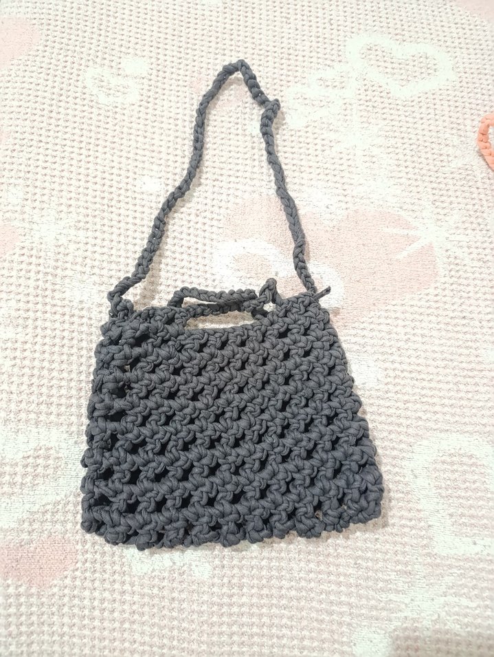 Gri renkli, örgü kumaştan yapılmış, bohem tarzda kadın çantası. Düz ve desensiz, kulp ve omuz askısı bulunur. koyu gri