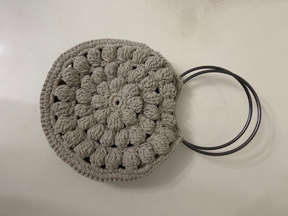 Yuvarlak tasarımlı, işleme detaylı gri örgü kadın çantası, metal halka saplı ve bohem tarzına uygun.