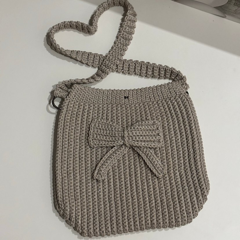 Kalın örgü askılı, fiyonk detaylı gri örgü kadın çantası, sade ve bohem tarzda rahat bir model.