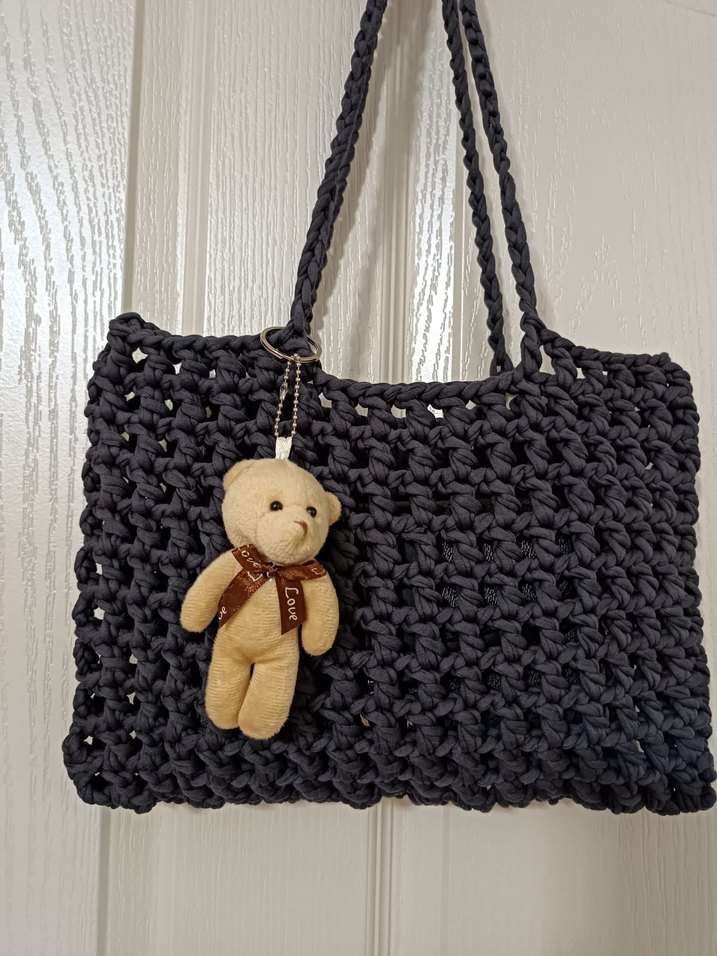 Gri örgü dokusuyla rahat ve örgü kadın çantası, küçük oyuncak ayı süsü içerir. Bohem ve retro tarzlar için uygundur.