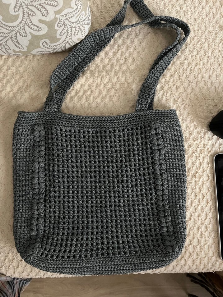 Gri renkli, örme dokulu kadın çanta. Polyester makrome ipinden örülmüştür. içerisinde gözlü astarı vardır